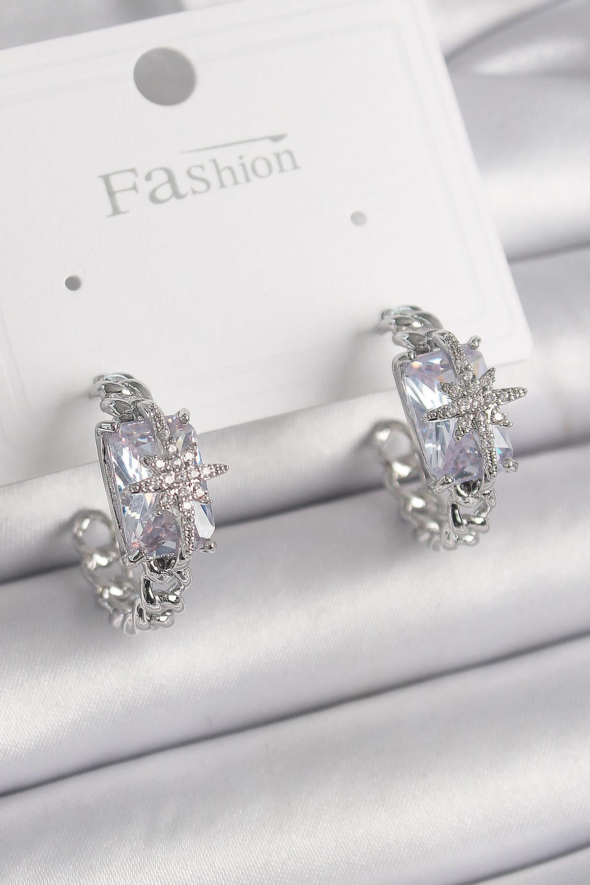 Pirinç Gümüş Renk Zirkon Taşlı Kutup Yıldız İşleme Detay Kadın Küpe