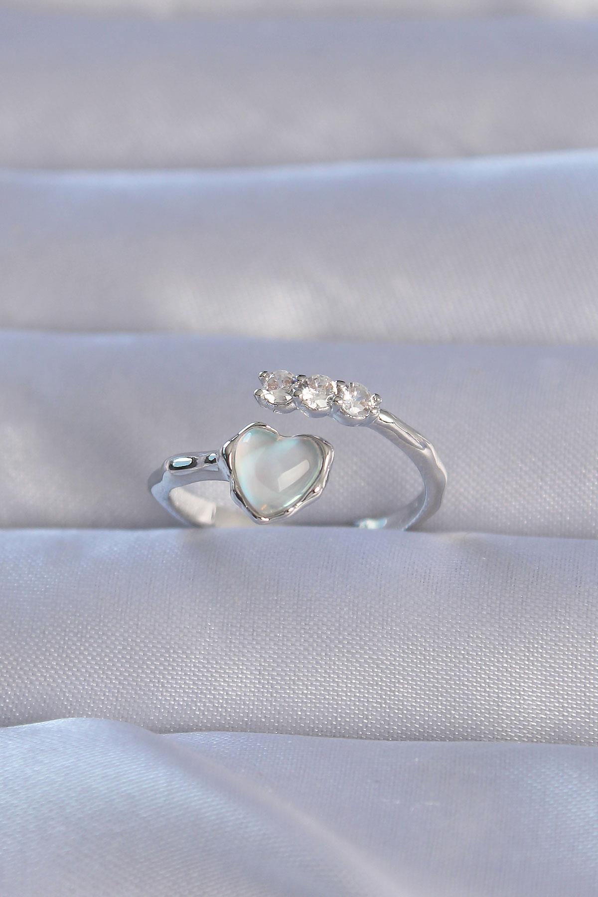 Pirinç Gümüş Renk Zirkon Taşlı Sedefli Kalp Model Ayarlanabilir Yüzük