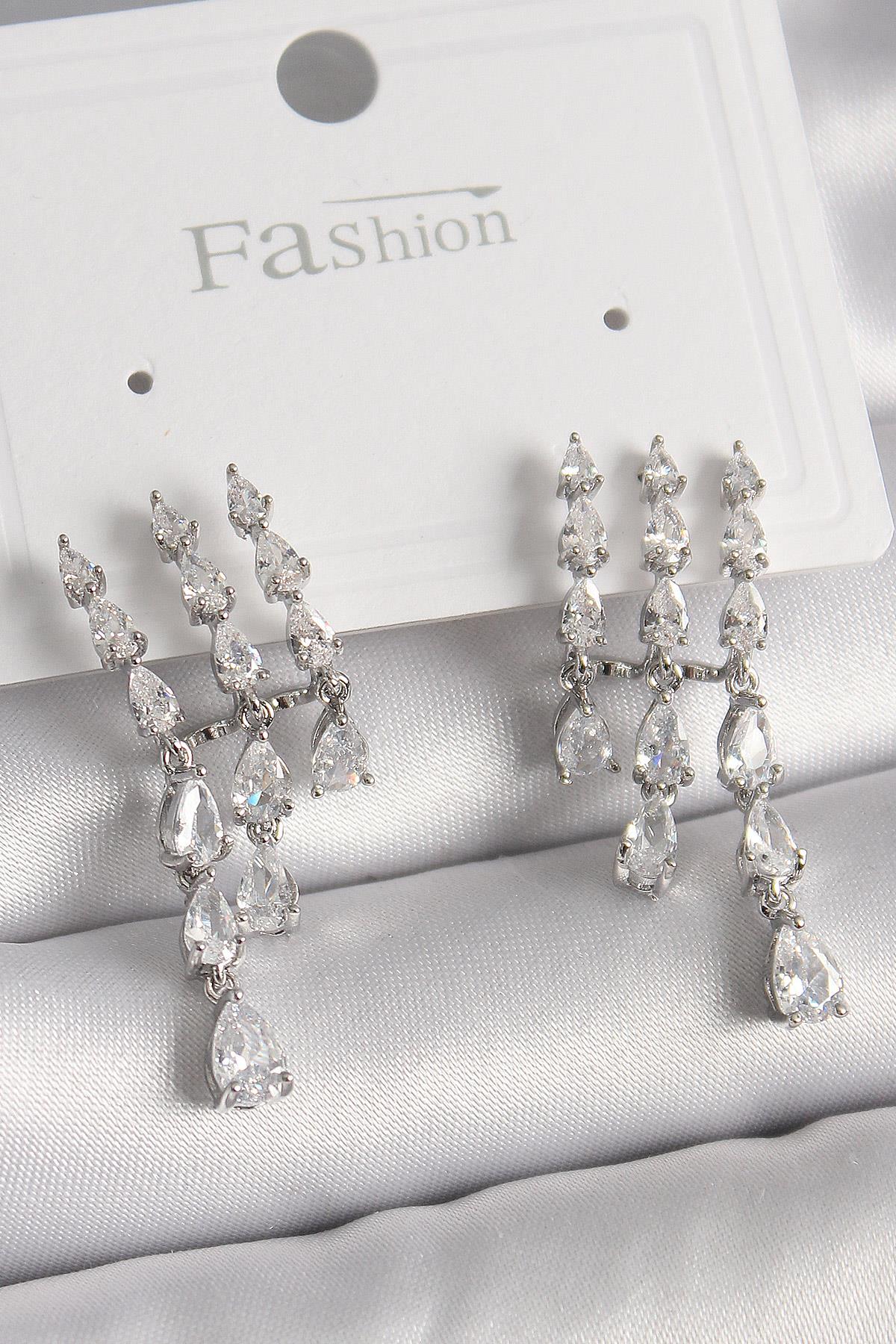 Pirinç Gümüş Renk Zirkon Taşlı Yağmur Model Kadın Küpe
