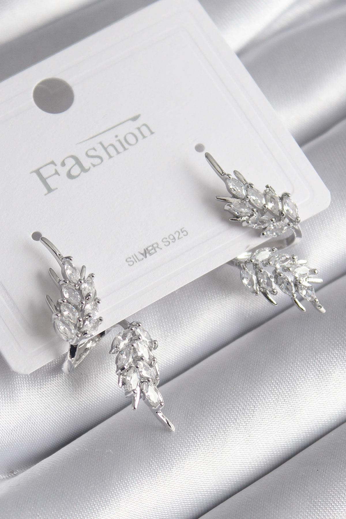 Pirinç Gümüş Renk Zirkon Taşlı Yaprak Model Kadın Küpe