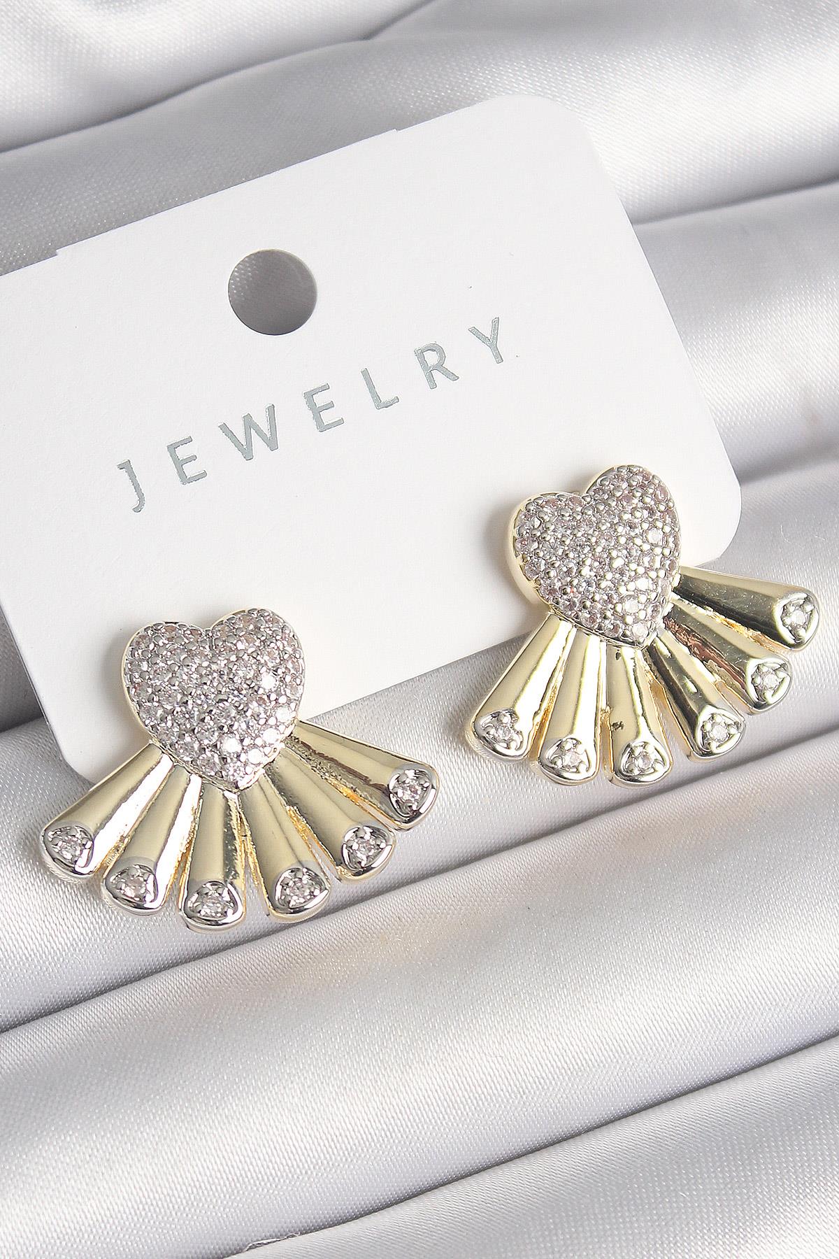 Pirinç Gümüş Renk Zirkon Taşlı Yelpaze Kalp Model Kadın Küpe