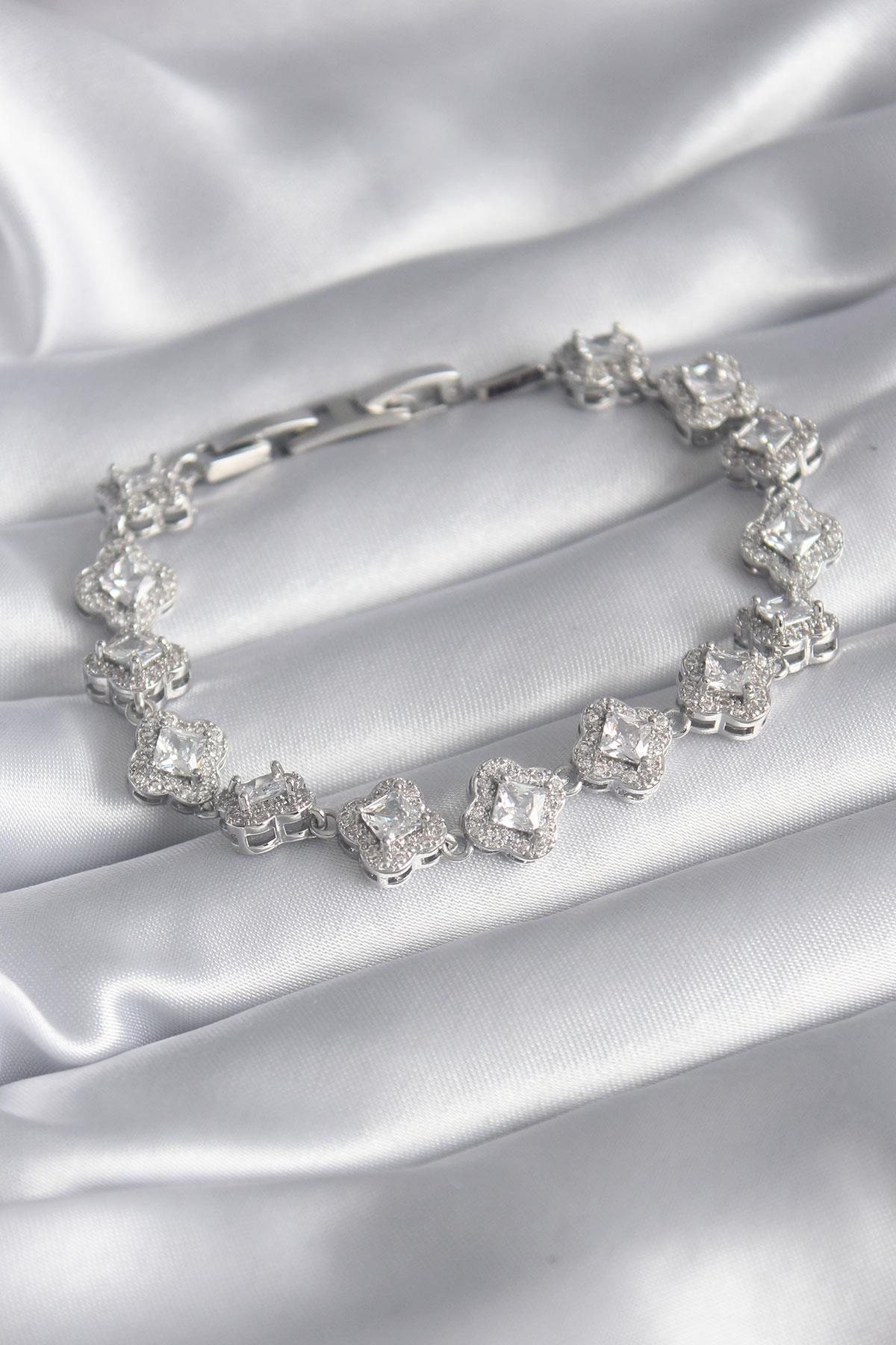 Pirinç Gümüş Renk Zirkon Taşlı Yonca Model VIP Seri Kadın Bileklik