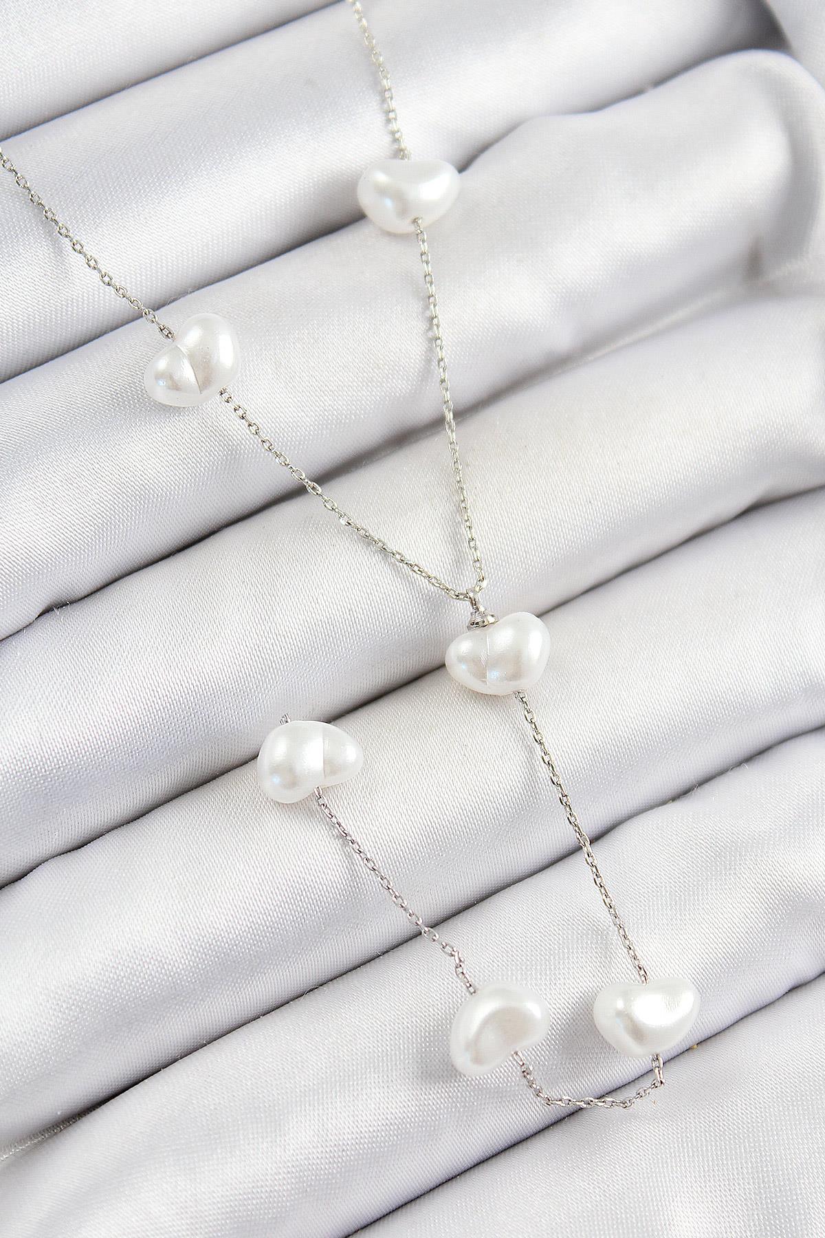 Pirinç İncili Kalp Figürlü Y Model Gümüş Renk Kadın Kolye