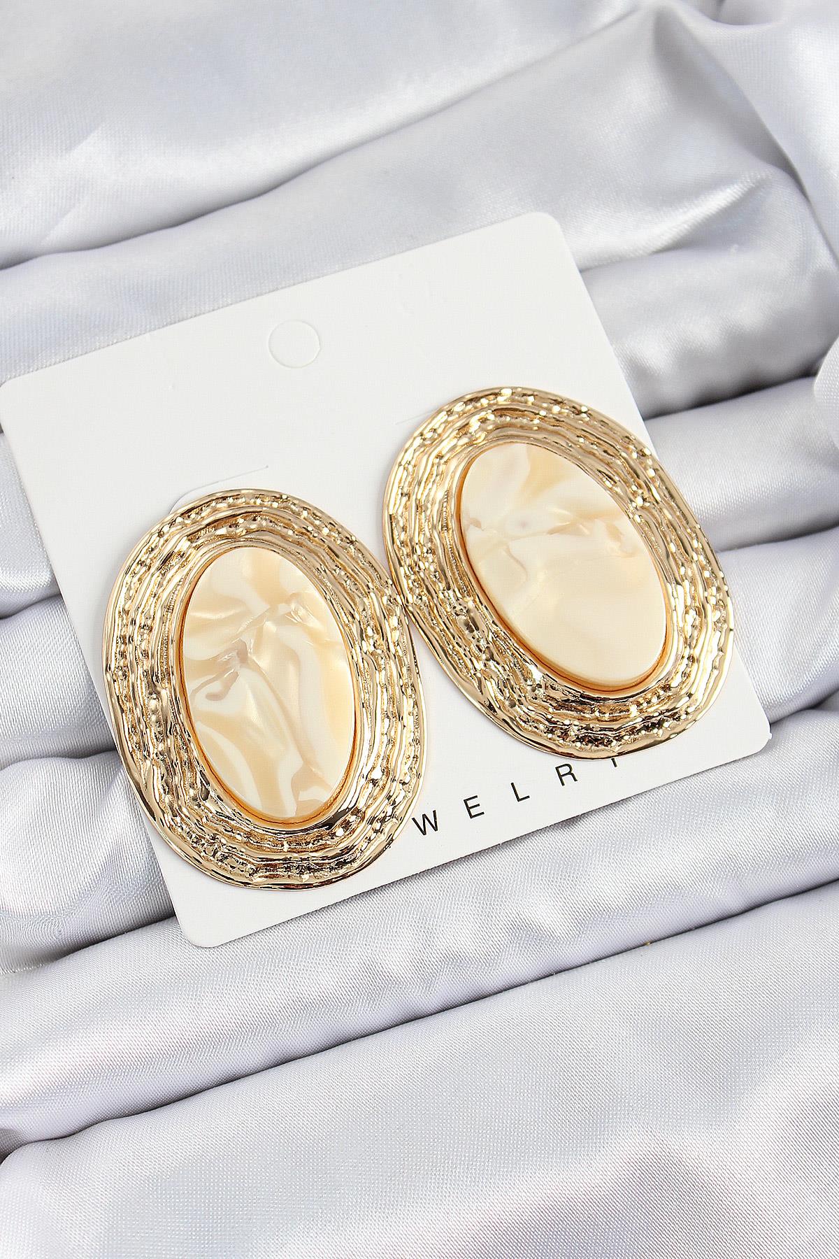 Pirinç Mermer Desenlli Bej Sedef Oval Vintage Model Gold Renk Kadın Küpe
