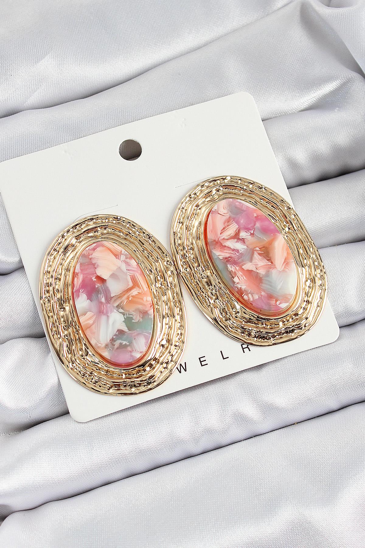Pirinç Mermer Desenlli Pembe Sedef Oval Vintage Model Gold Renk Kadın Küpe