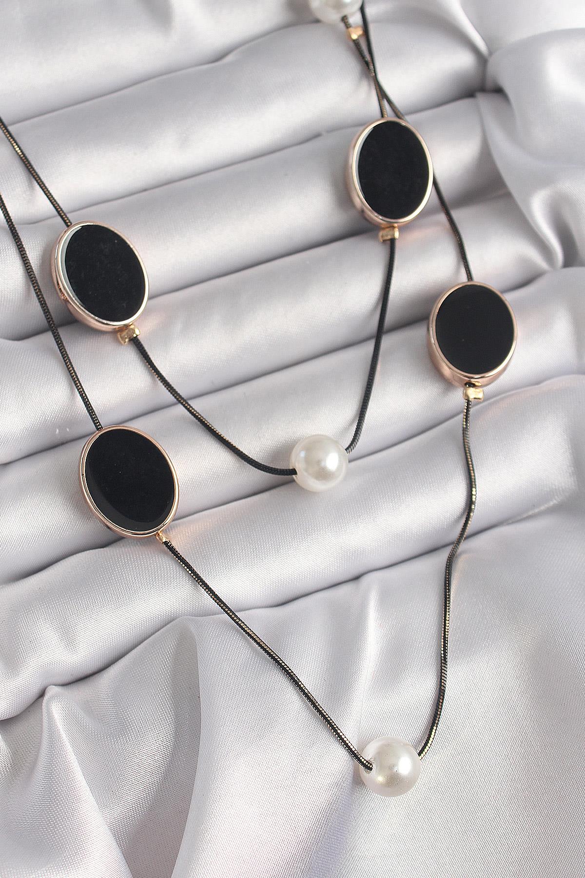 Pirinç Siyah Renk Zincir İnci Detaylı Çoklu Kadın Kolye