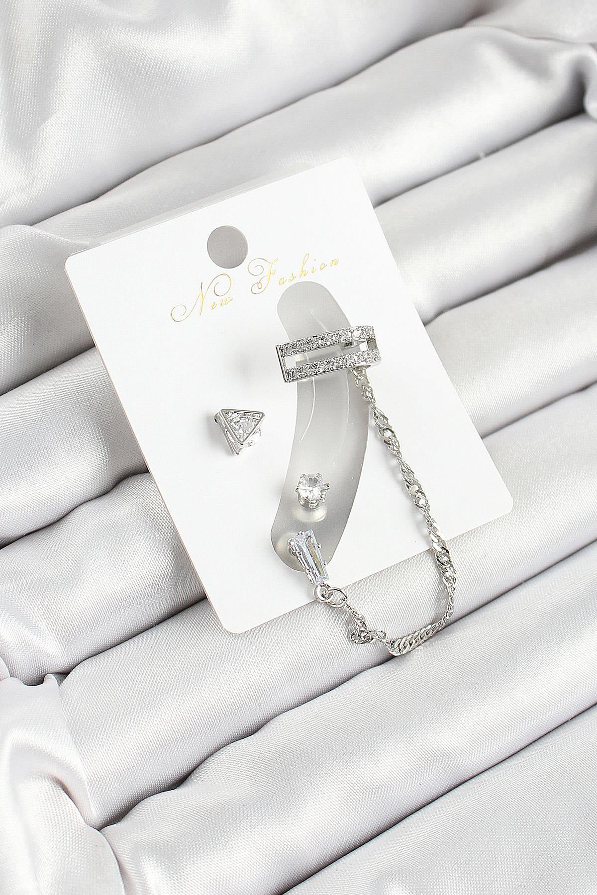 Pirinç Üçgen Figürlü Zirkon Taşlı Gümüş Renk 3'lü Kıkırdak Kadın Küpe Set
