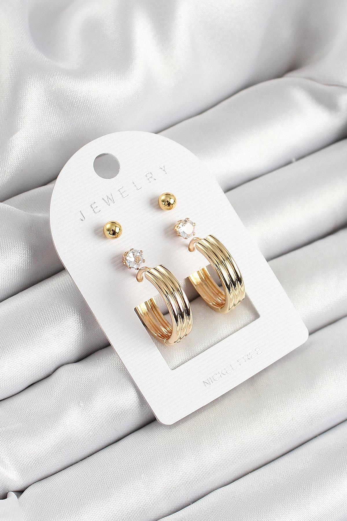 Pirinç Zirkon Taş Ve Halka Figürlü Gold Renk 3'lü Çift Kadın Küpe Set