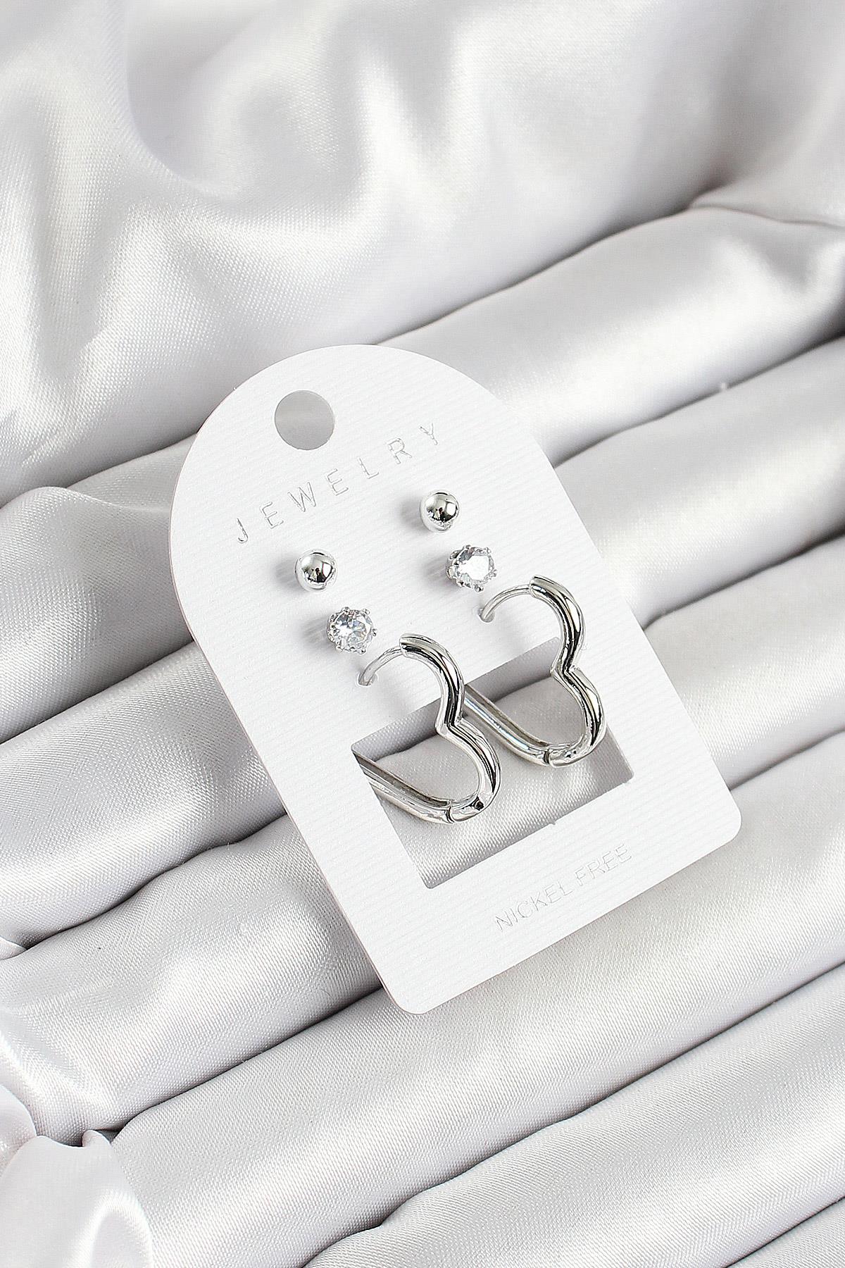 Pirinç Zirkon Taş Ve Kalp Figürlü Gümüş Renk 3'lü Çift Kadın Küpe Set