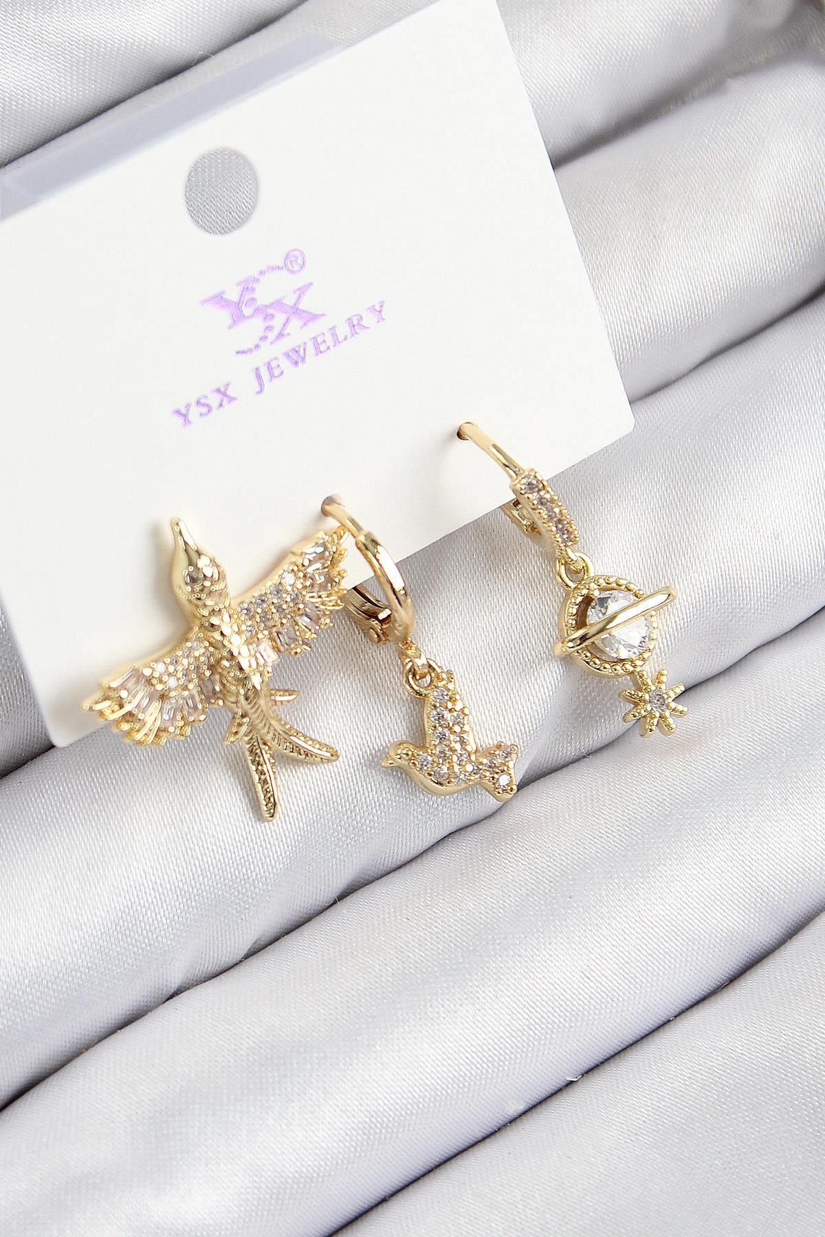 Pirinç Zirkon Taşlı 3'lü Kuş Model Gold Renk Kadın Küpe