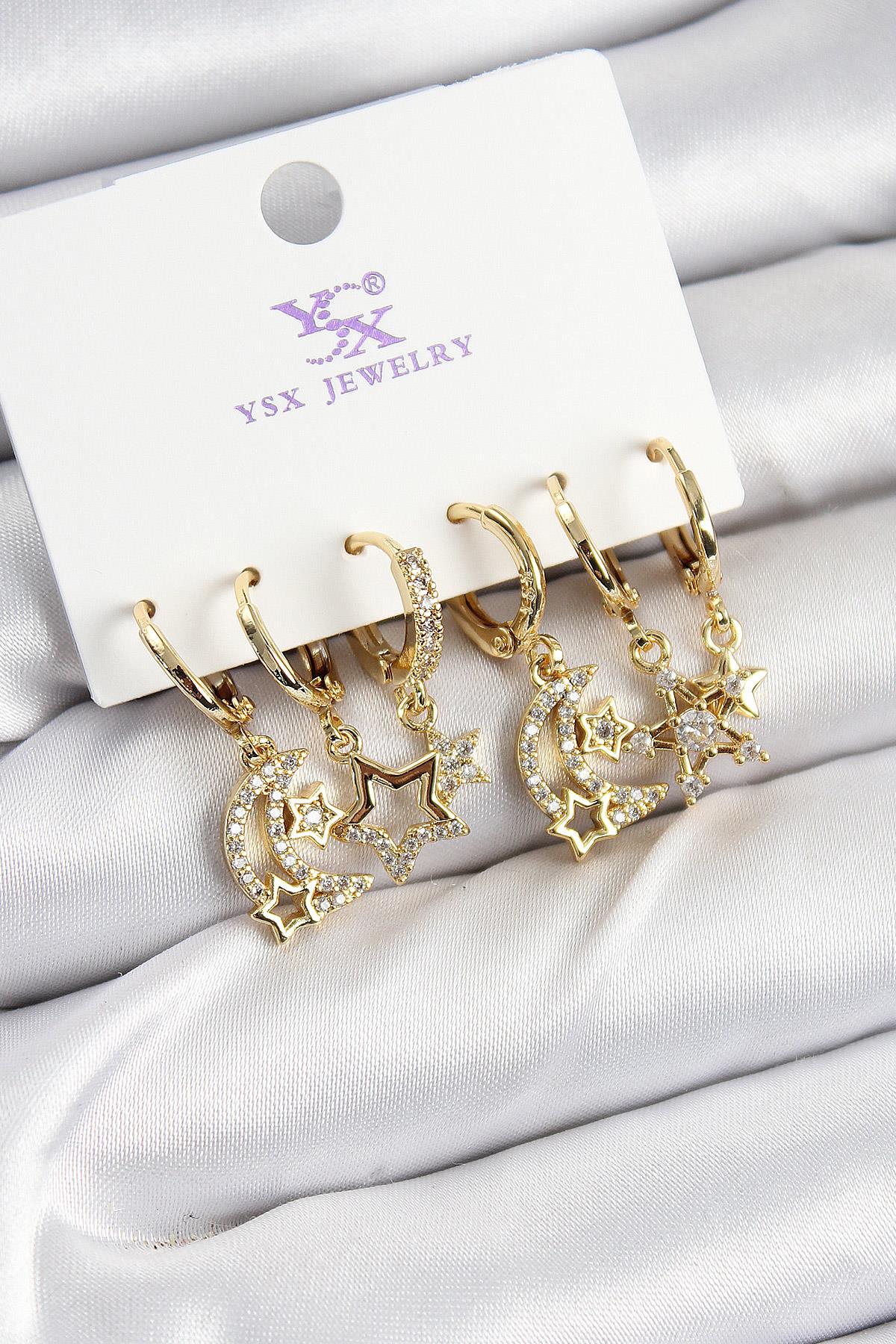 Pirinç Zİrkon Taşlı Ay ve Yıldız Model Gold Renk 3'lü Çift Kadın Küpe