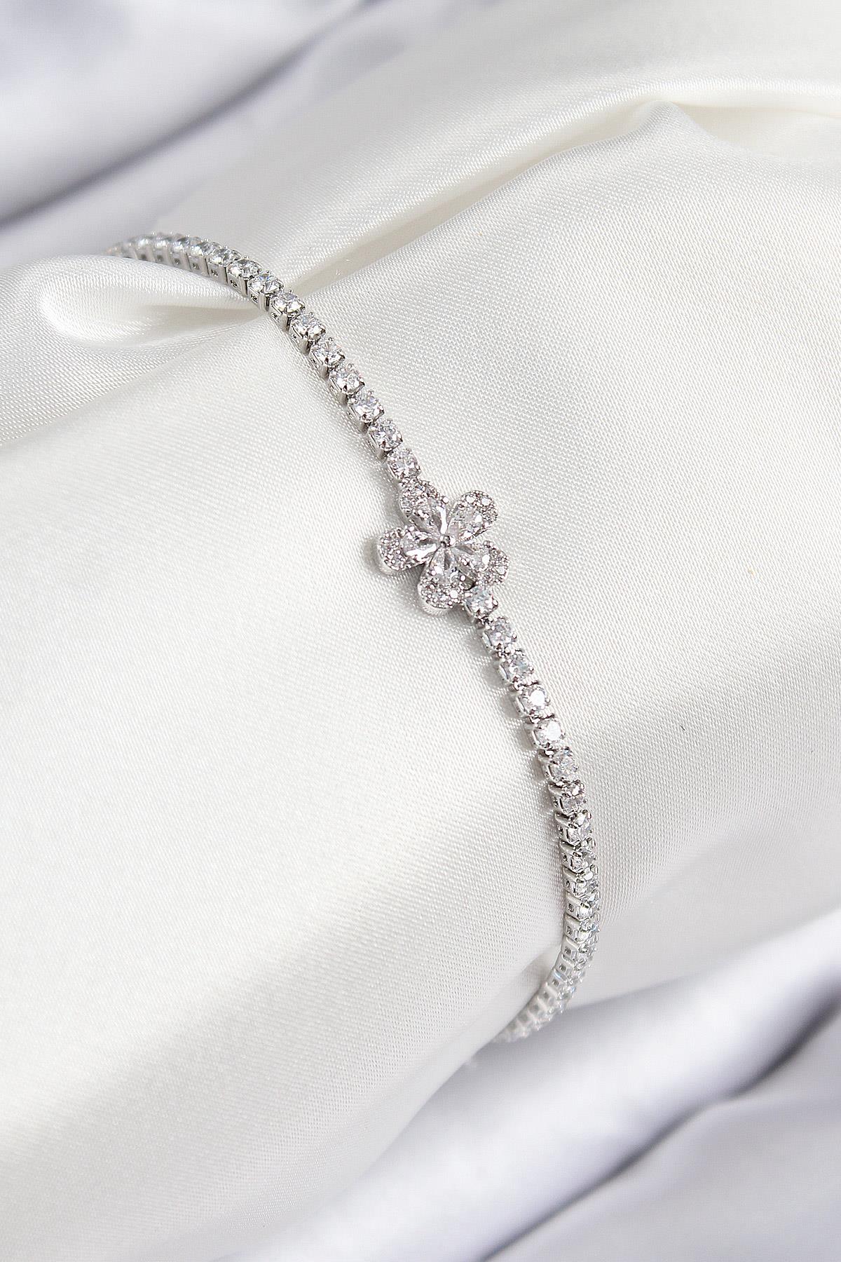 Pirinç Zirkon Taşlı Çiçek Model Gümüş Renk Kadın Bileklik