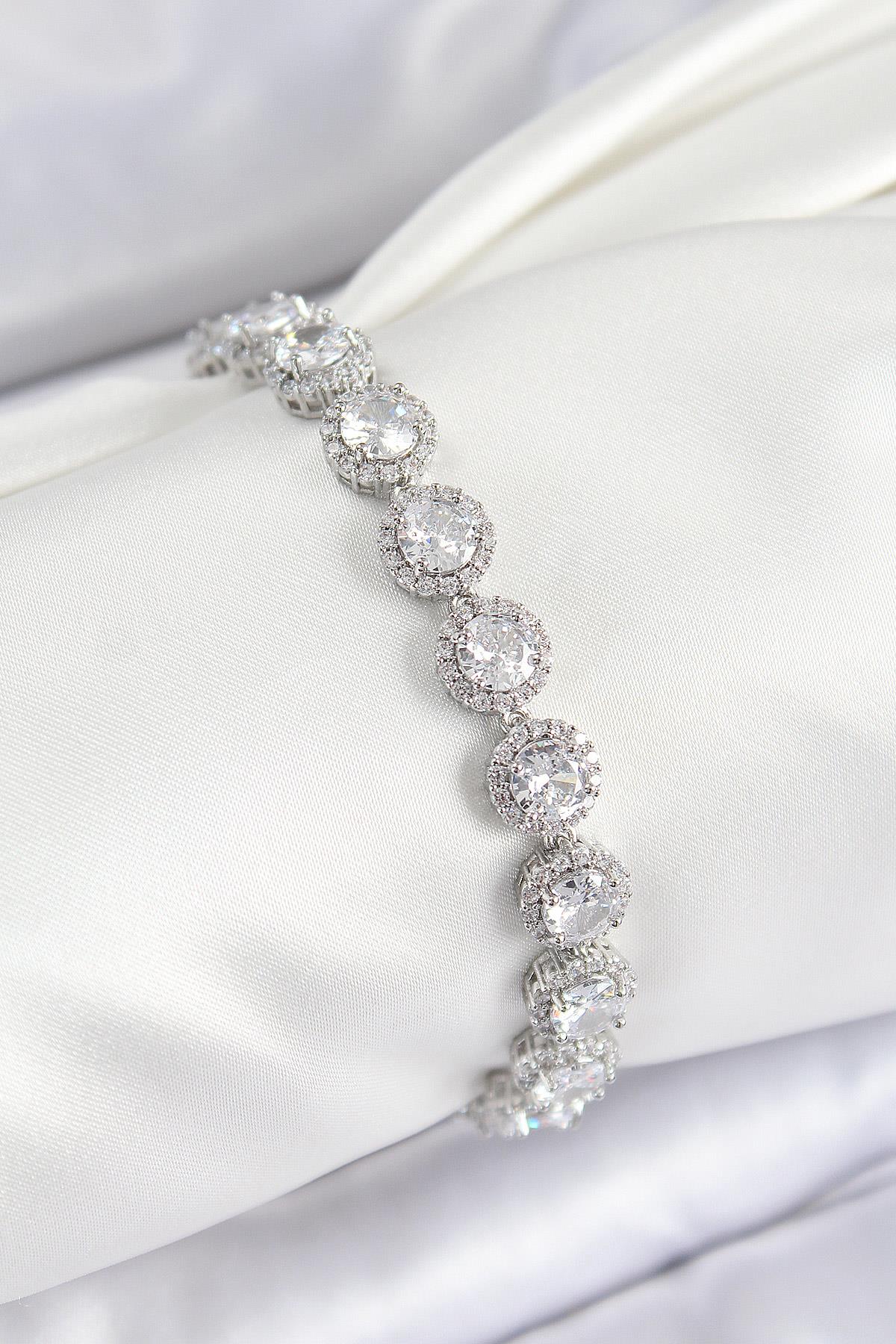 Pirinç Zirkon Taşlı Daire Baget Model Gümüş Renk VIP Seri Kadın Bileklik