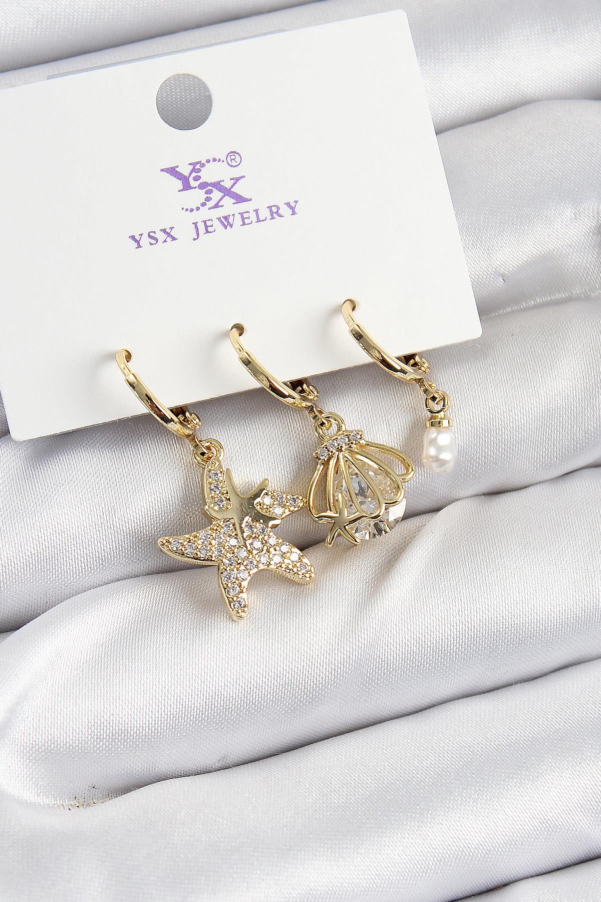 Pirinç Zİrkon Taşlı Deniz Yıldızı Ve İstiridye Model Gold Renk 3'lü Kadın Küpe