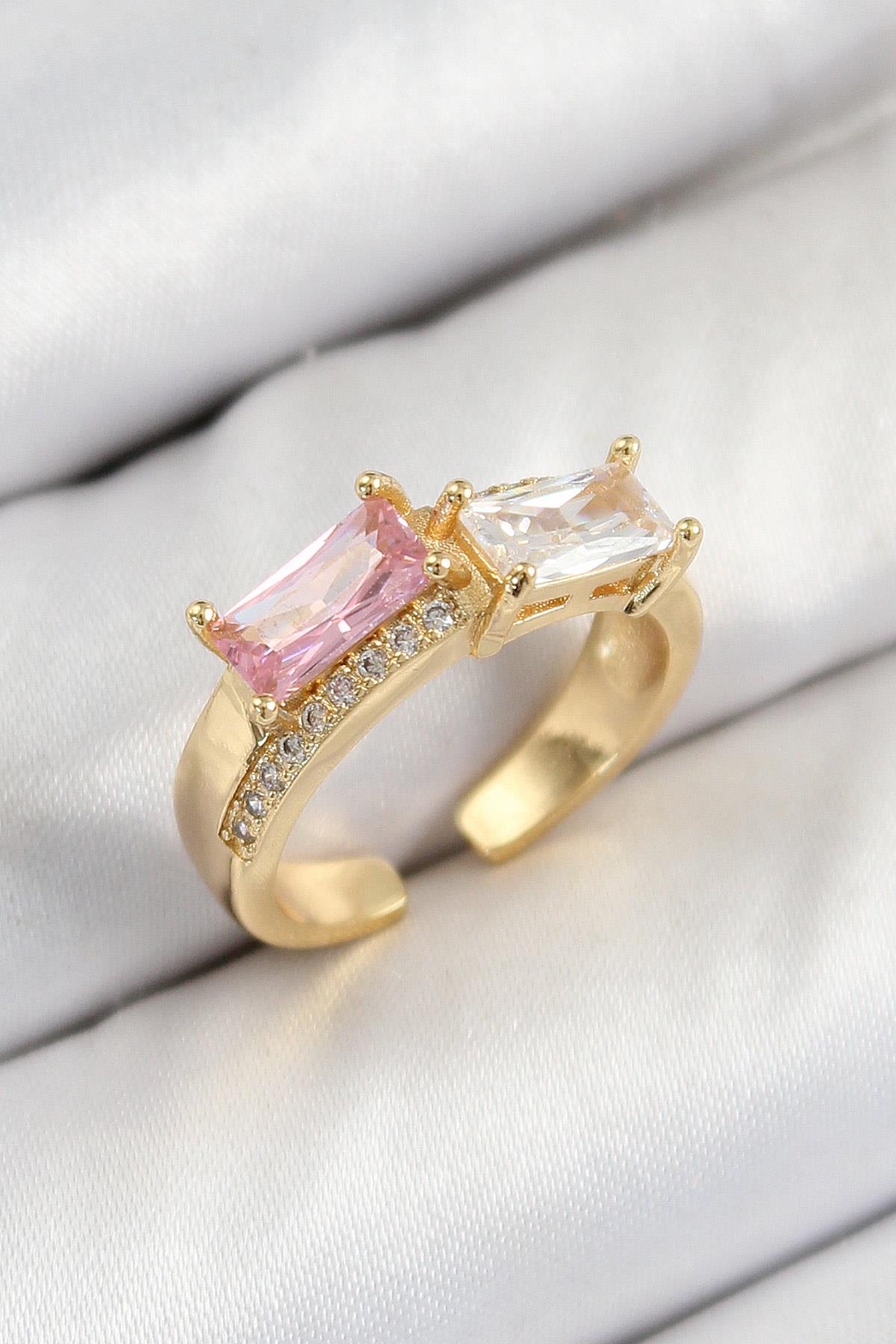 Pirinç Zirkon Taşlı Dikdörtgen Model Gold Renk Kadın Yüzük