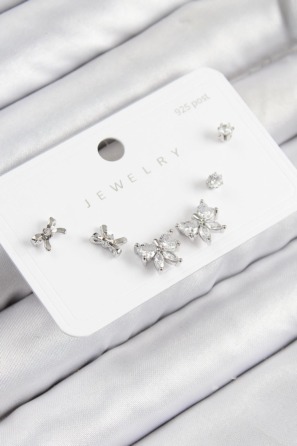 Pirinç Zirkon Taşlı Fiyonk Model Gümüş Renk 925 Ayar Gümüş Çivi Kadın Küpe Set
