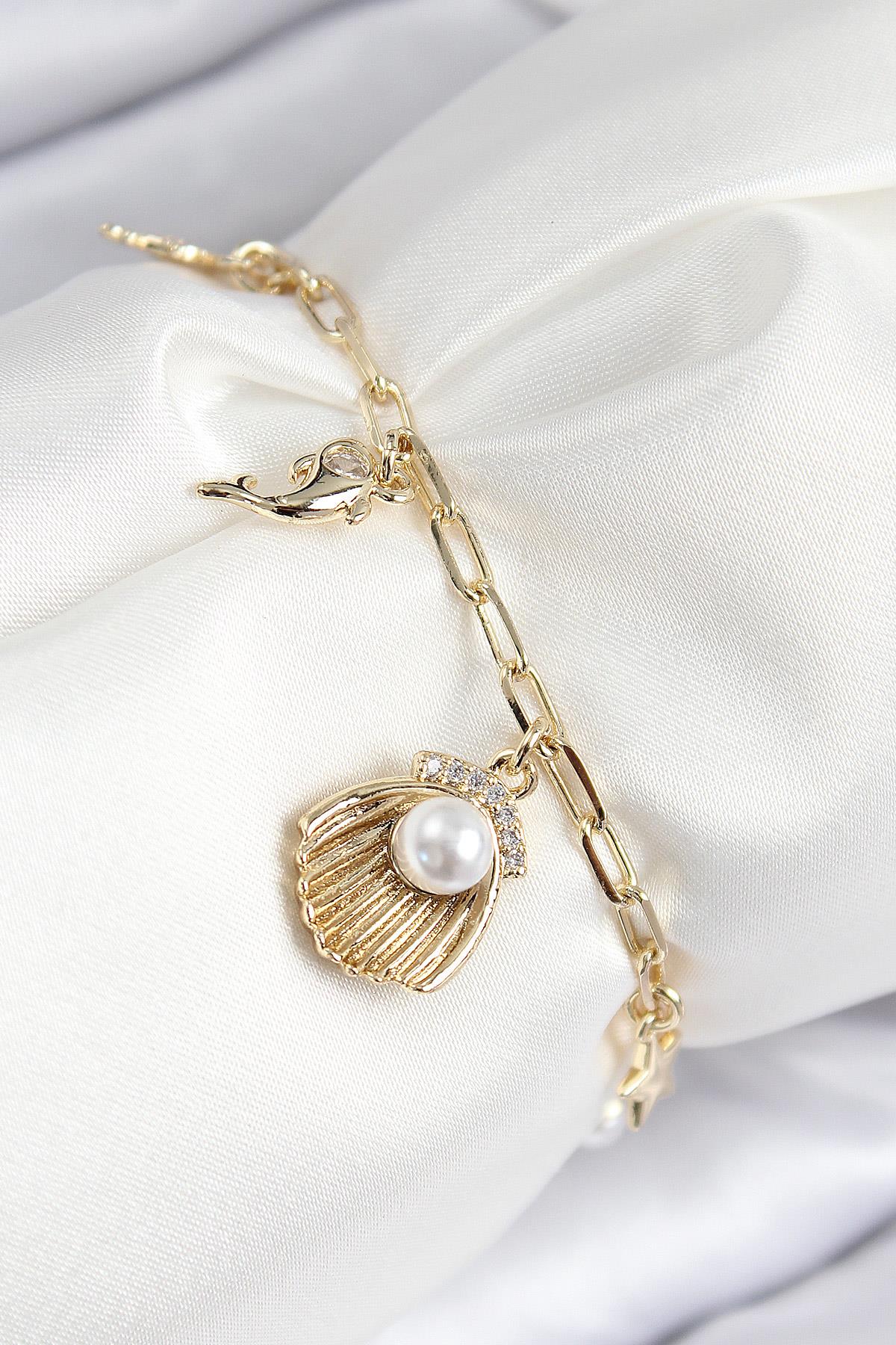 Pirinç Zirkon Taşlı İncili İstiridye Model Gold Renk Kadın Bileklik
