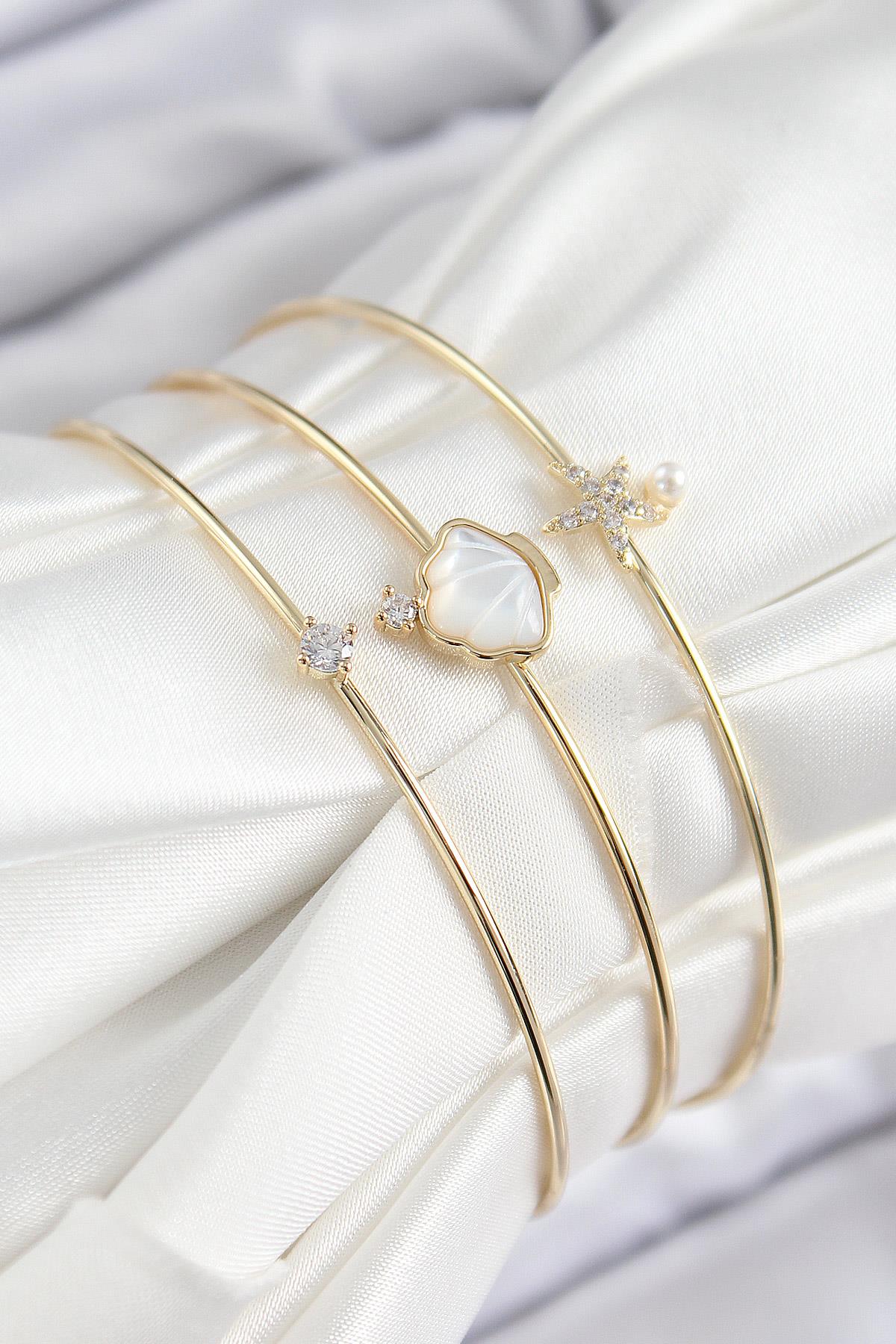 Pirinç Zirkon Taşlı İstiridye Ve Deniz Yıldızı Model Gold Renk Vip 3'lü Kadın Bileklik