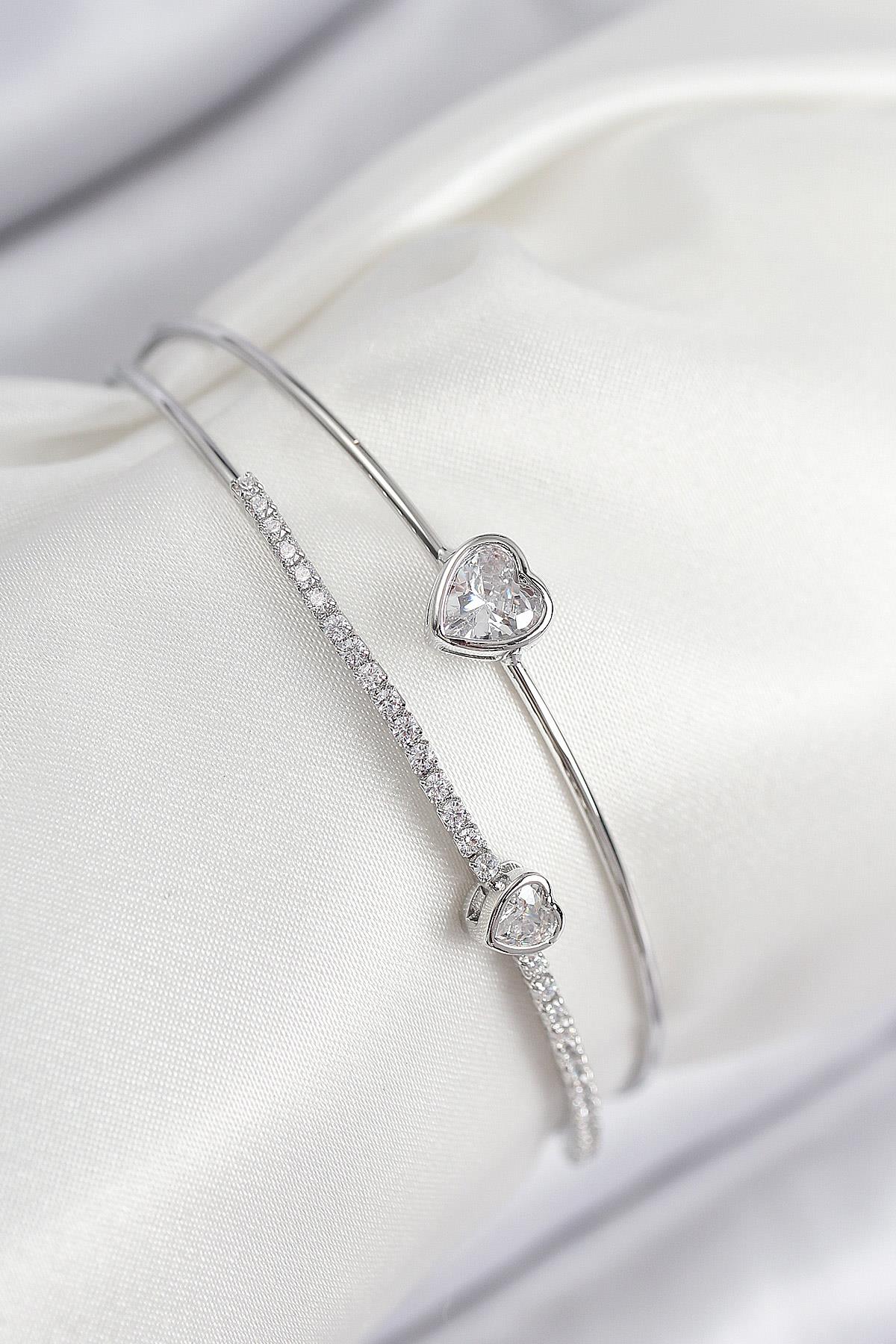Pirinç Zirkon Taşlı Kalp Model Gümüş Renk Kadın Bileklik