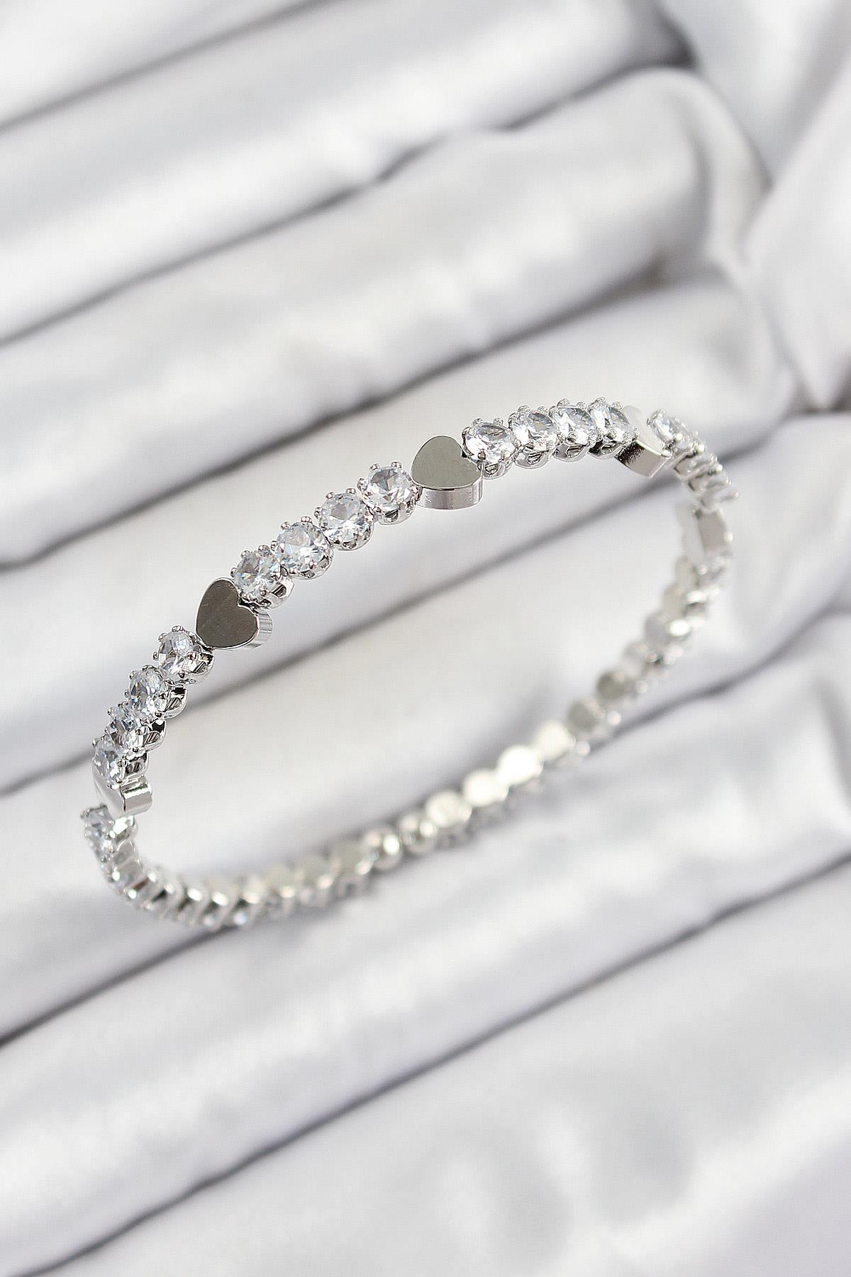 Pirinç Zirkon Taşlı Kalp Model Gümüş Renk Yaylı Kadın Bileklik