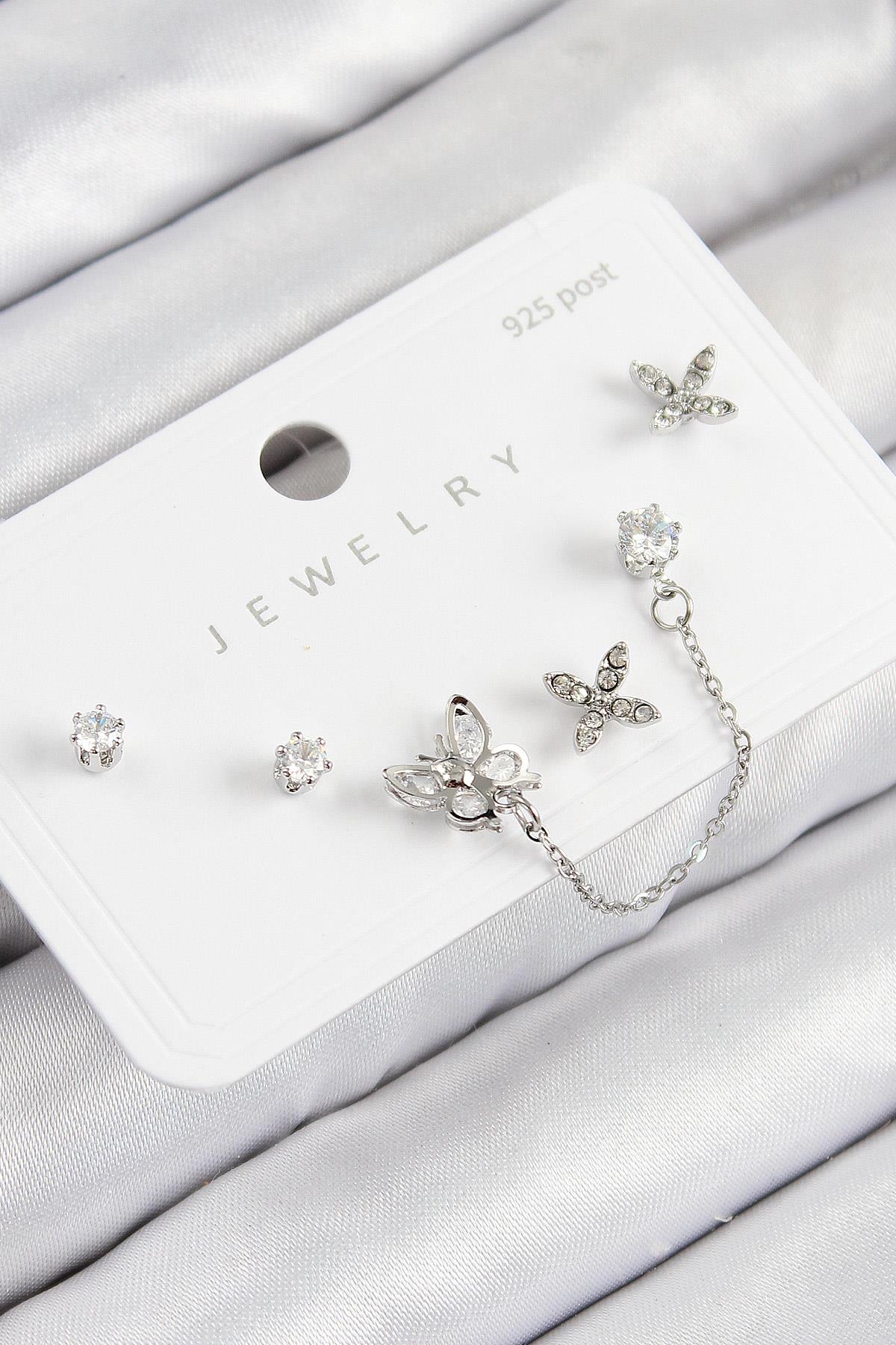 Pirinç Zirkon Taşlı Kelebek Model Gümüş Renk 925 Ayar Gümüş Çivi Kadın Küpe Set