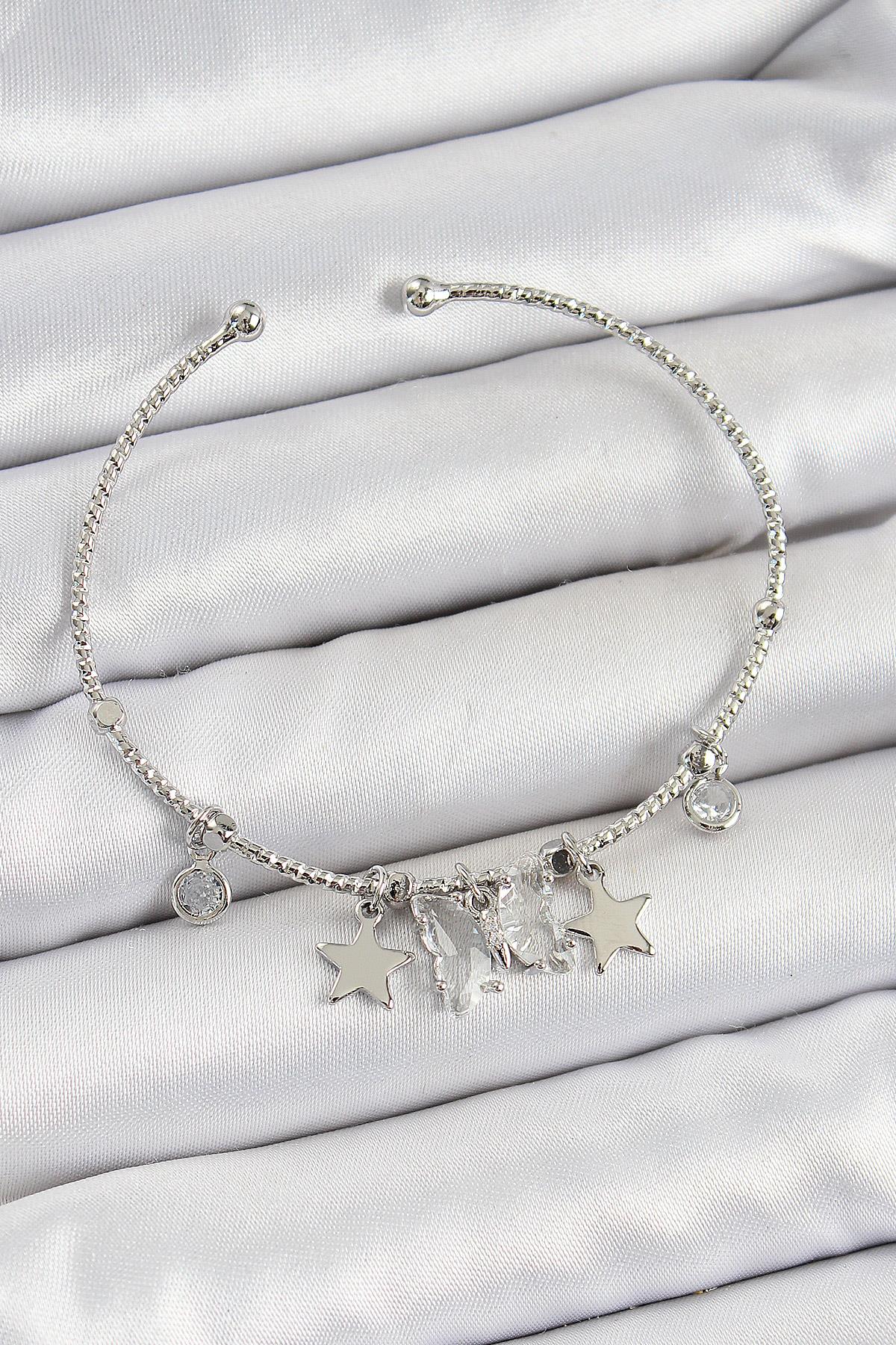 Pirinç Zirkon Taşlı Kelebek Ve Yıldız Model Gümüş Renk Charm Bileklik