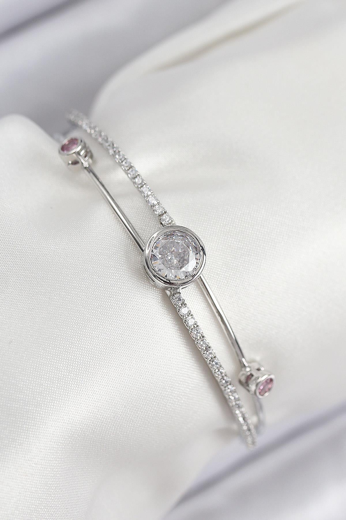Pirinç Zirkon Taşlı Pırlanta Model Gümüş Renk Kadın Bileklik