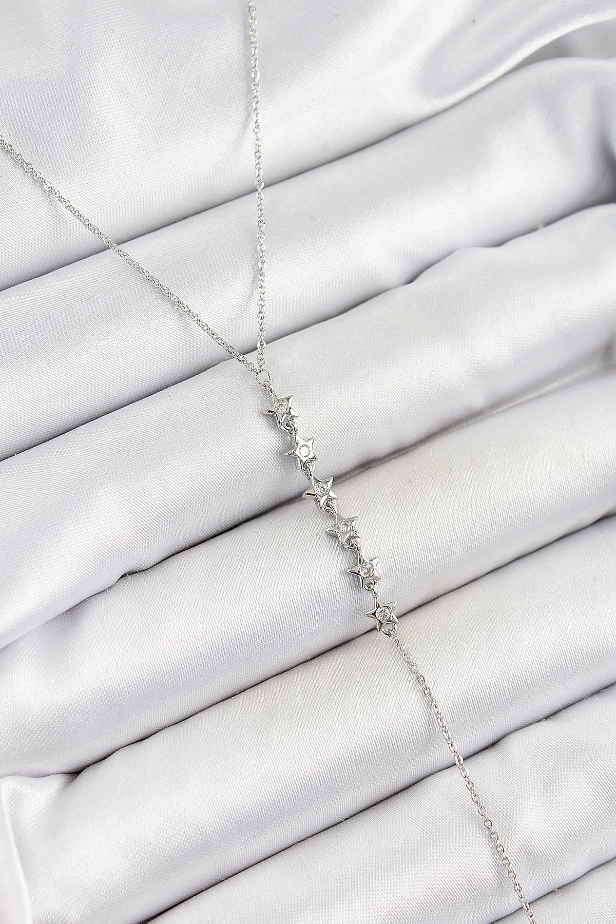 Pirinç Zirkon Taşlı Sıralı Yıldız Figürlü Y Model Gümüş Renk Kadın Kolye