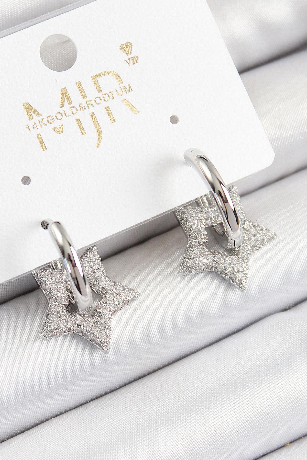 Pirinç Zirkon Taşlı Yıldız Figürlü Halka Model Gümüş Renk Kadın Küpe