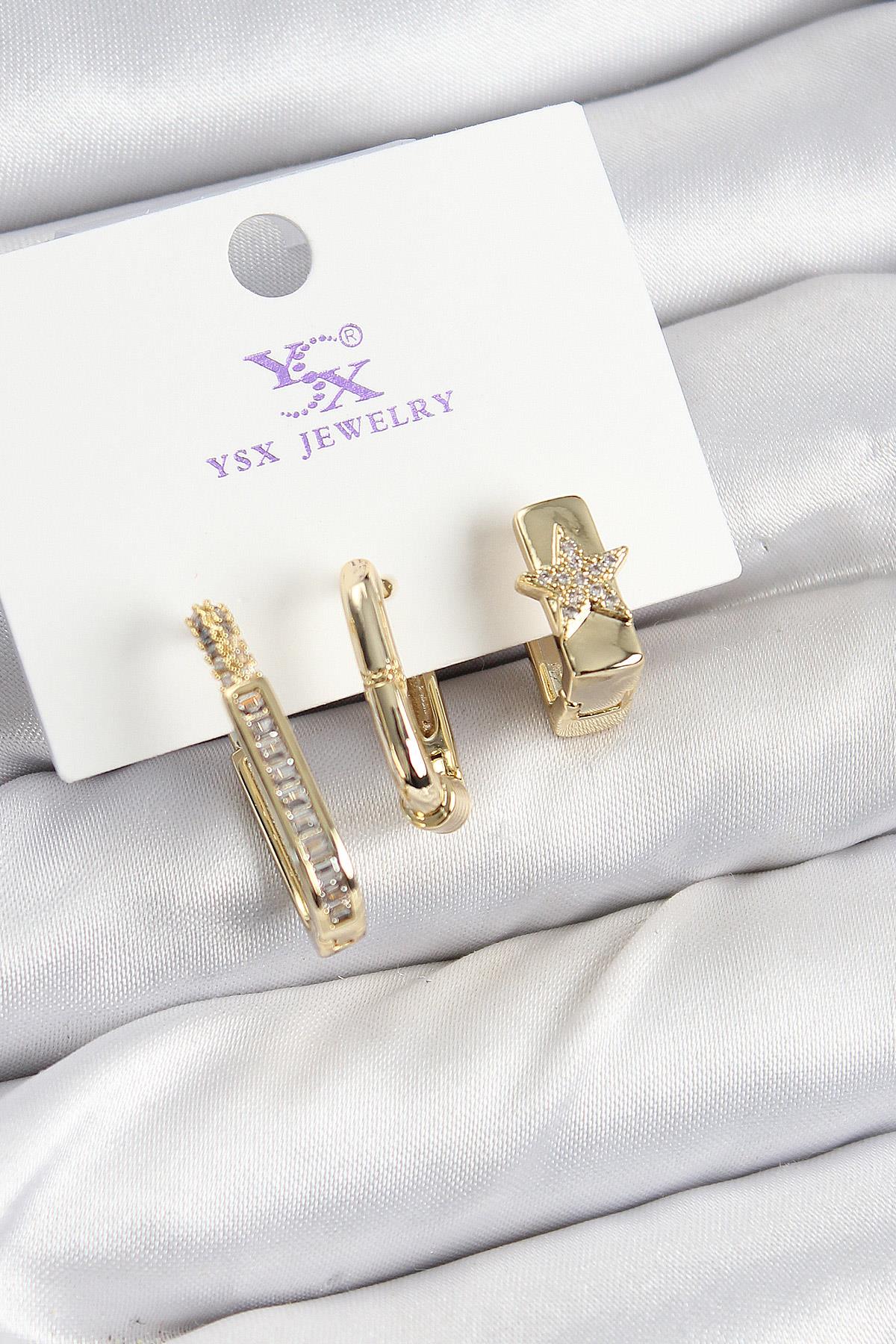 Pirinç Zİrkon Taşlı Yıldız Model Gold Renk 3'lü Kadın Küpe