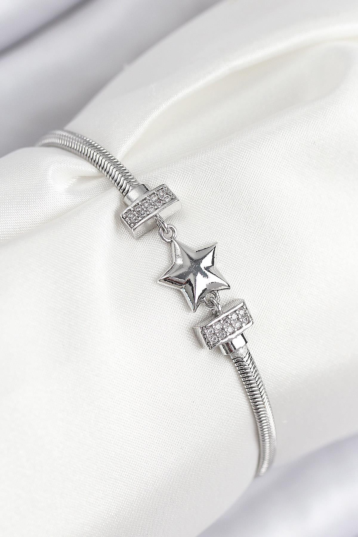 Pirinç Zirkon Taşlı Yonca Model Gümüş Renk Kadın Bileklik