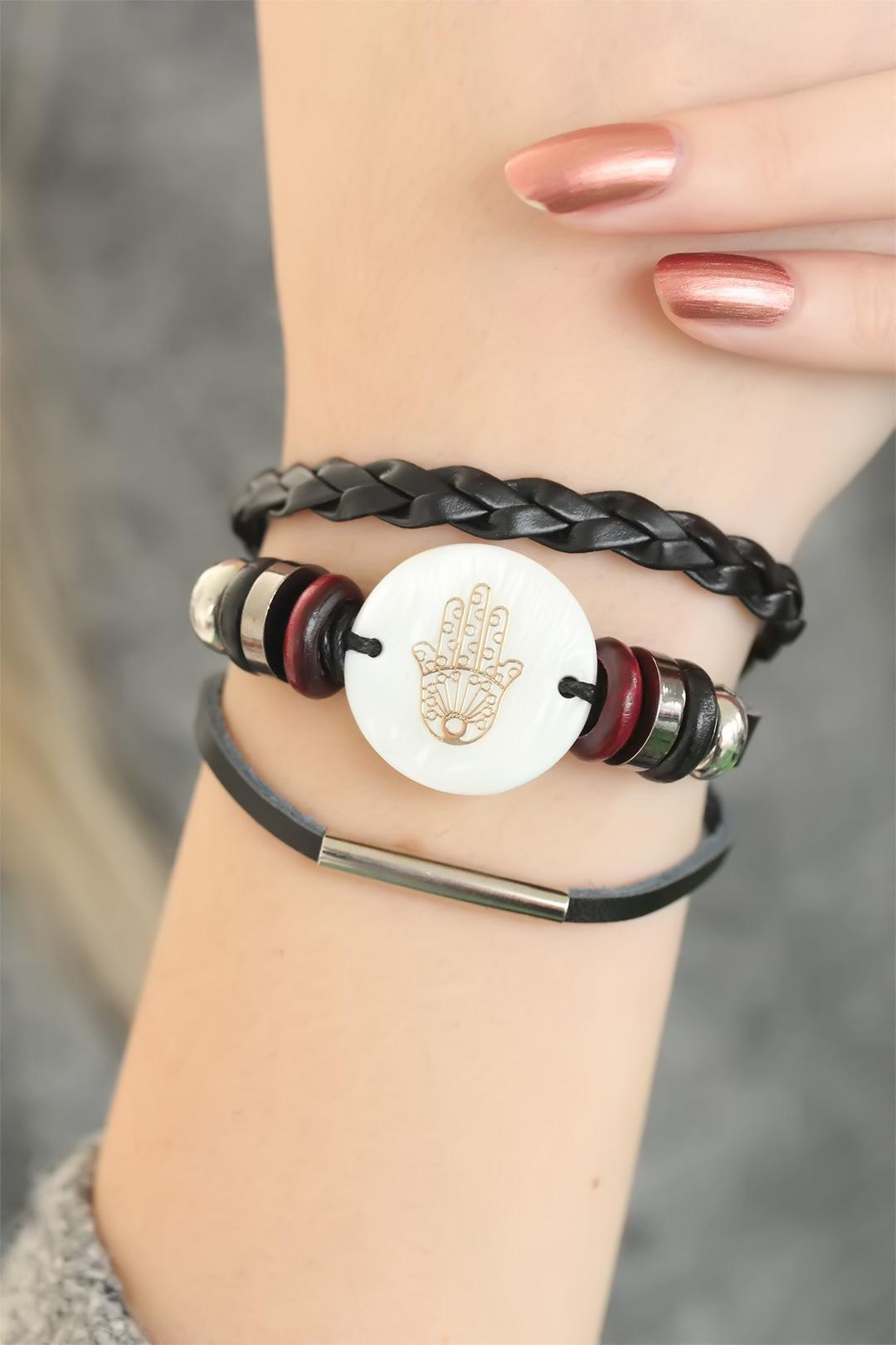 Siyah Renk Fatma Ana Eli Tasarım Çoklu Deri Bayan Bileklik