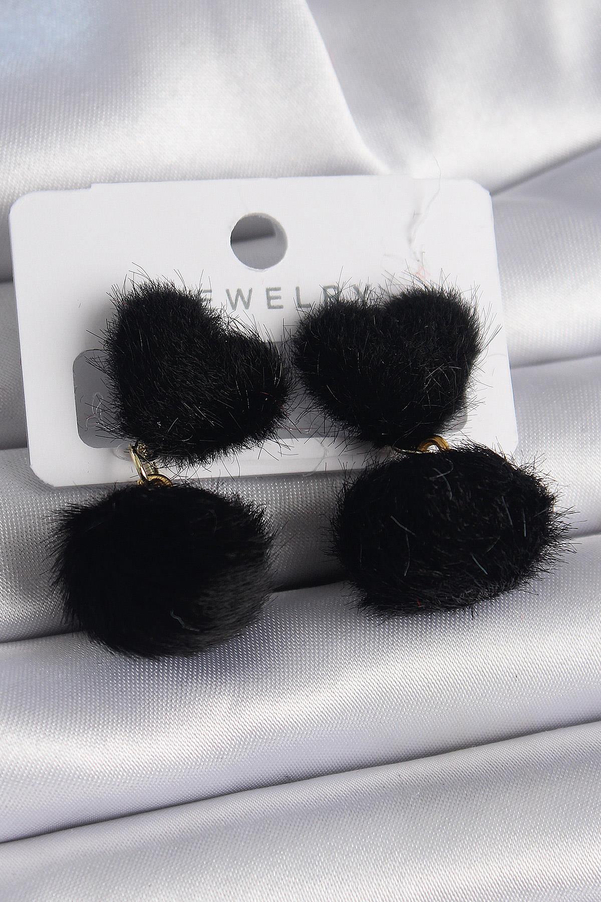 Siyah Tüylü Ponpon Model Kadın Küpe