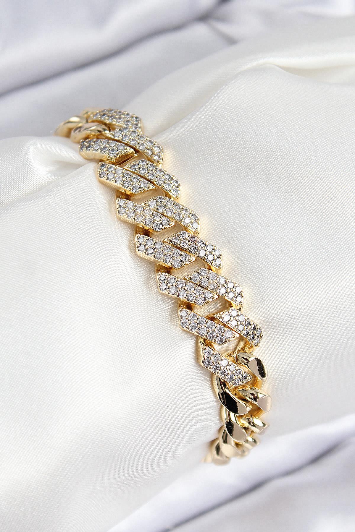 VIP Pirinç Zirkon Taşlı Cuba Model Gold Renk Kadın Bileklik