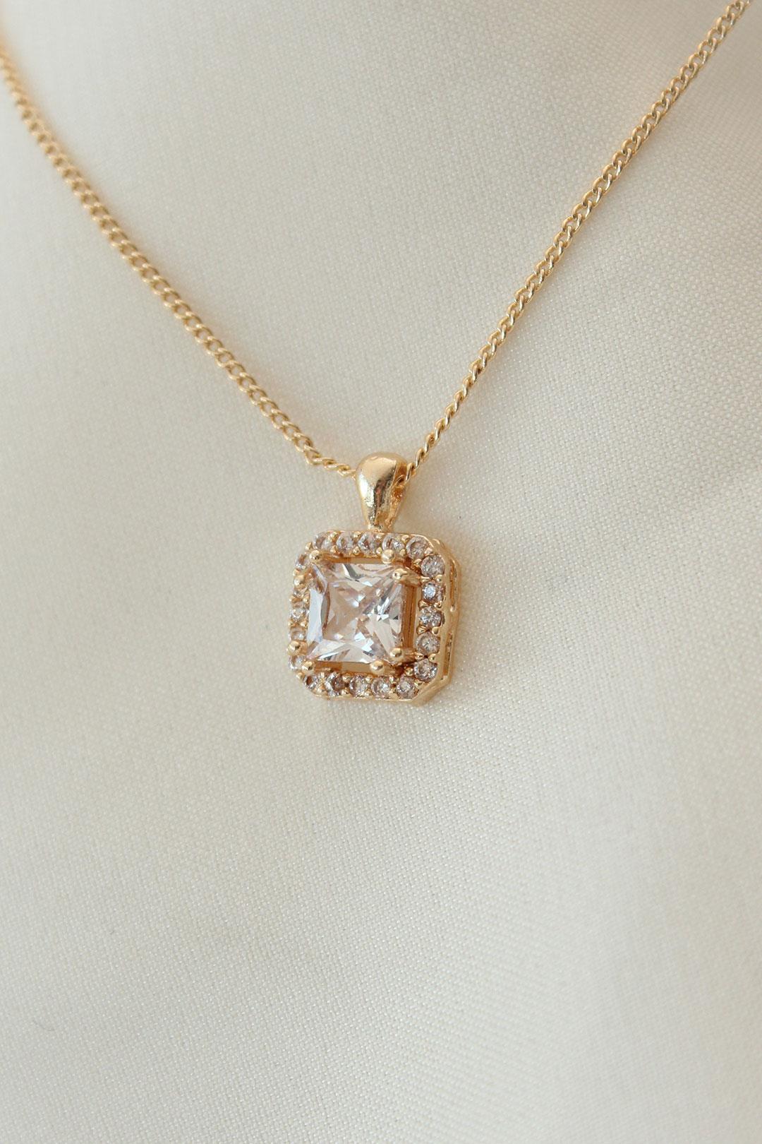 Zirkon ve Kristal Taşlı Kare Kolye